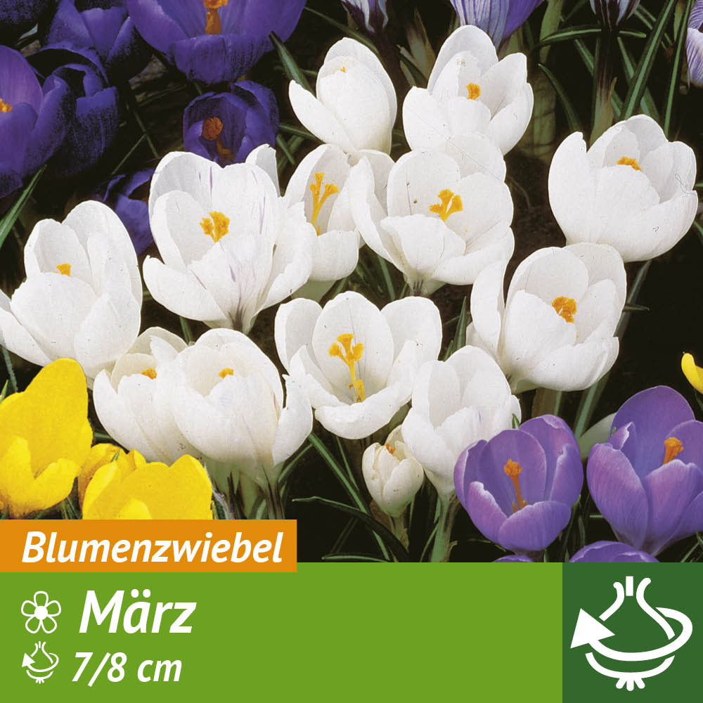 Diese großblumigen Krokusse wirken besonders schön auf Rasen, in Steingärten oder vor Gehölzen. Der Blumenzwiebel-Umfang beträgt ca. 7 bis 8 cm.
