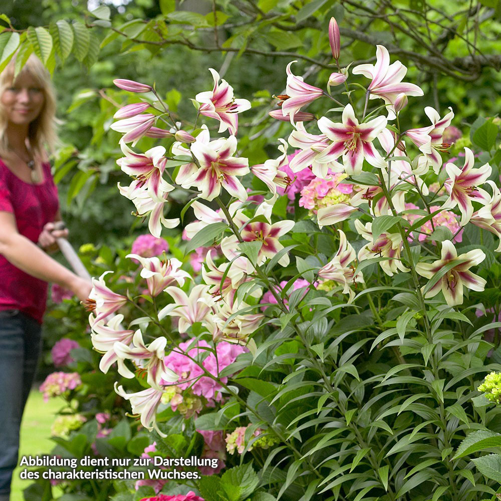 Hinweis Lilien stehen gerne in der Sonne - den Pflanzenfuß bzw. Wurzelbereich mögen sie jedoch beschattet, daher vorzugsweise einen Standort zwischen Bodendecker oder niedrige Stauden wählen