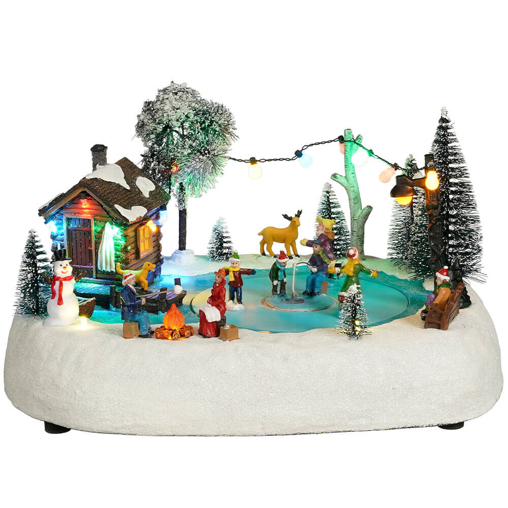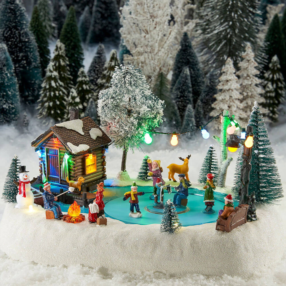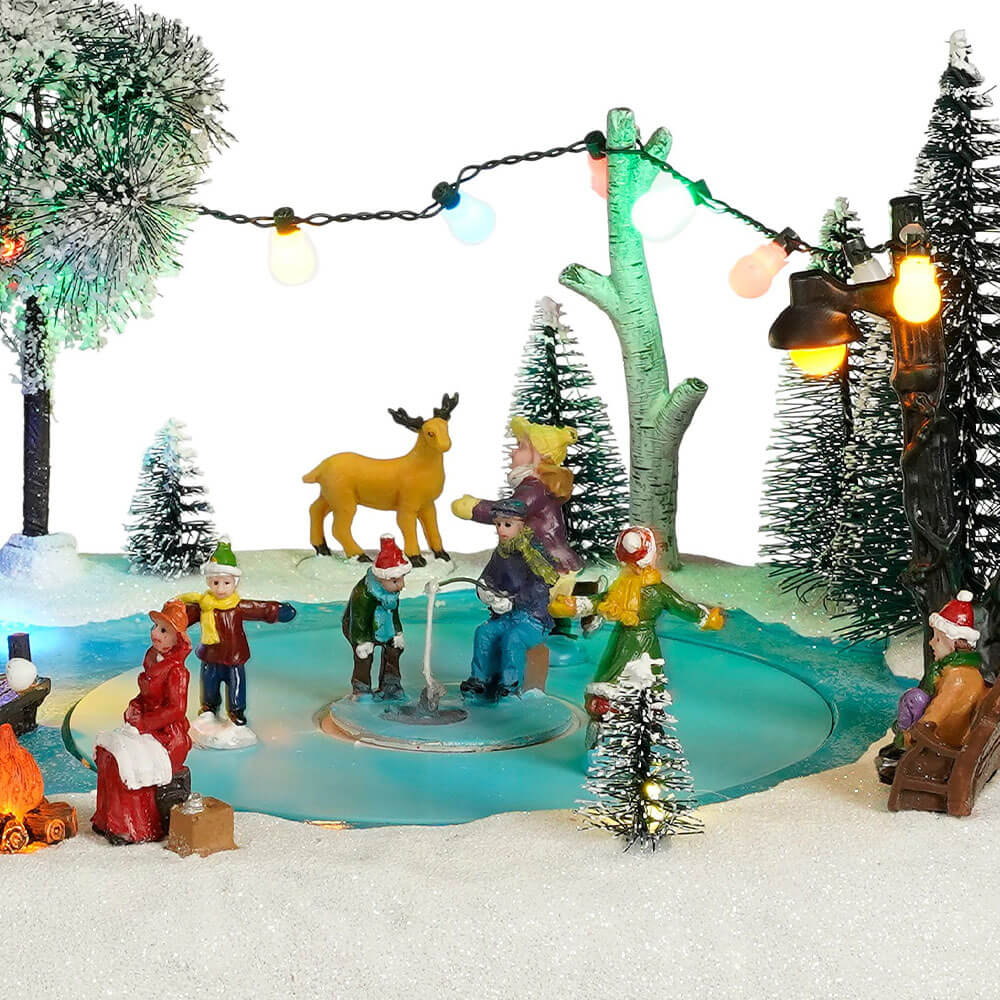 Die batteriebetriebene Schlittschuhszene von LuVille bezaubert durch ihre vielen liebevollen Details sowie die animierten Schlittschuhläufer auf dem Eis. In der Mitte der Eisfläche findet sich ein Eisfischer, dessen Angel von einem neugierigen Kind aufmerksam beobachtet wird. Auch ein Reh und ein Hund haben sich zur Gruppe gesellt. Am warm leuchtenden Lagerfeuer wird am Stock gegrillt und sich aufgewärmt. Weitere Lichtquellen finden sich in Form einer Lichterkette, die von der Fischerhütte über Bäume bis zur Laterne auf der anderen Seite des Teichs gespannt ist. Lassen Sie sich von der winterlichen Szenerie verzaubern und in die schönsten Winterferien versetzen.