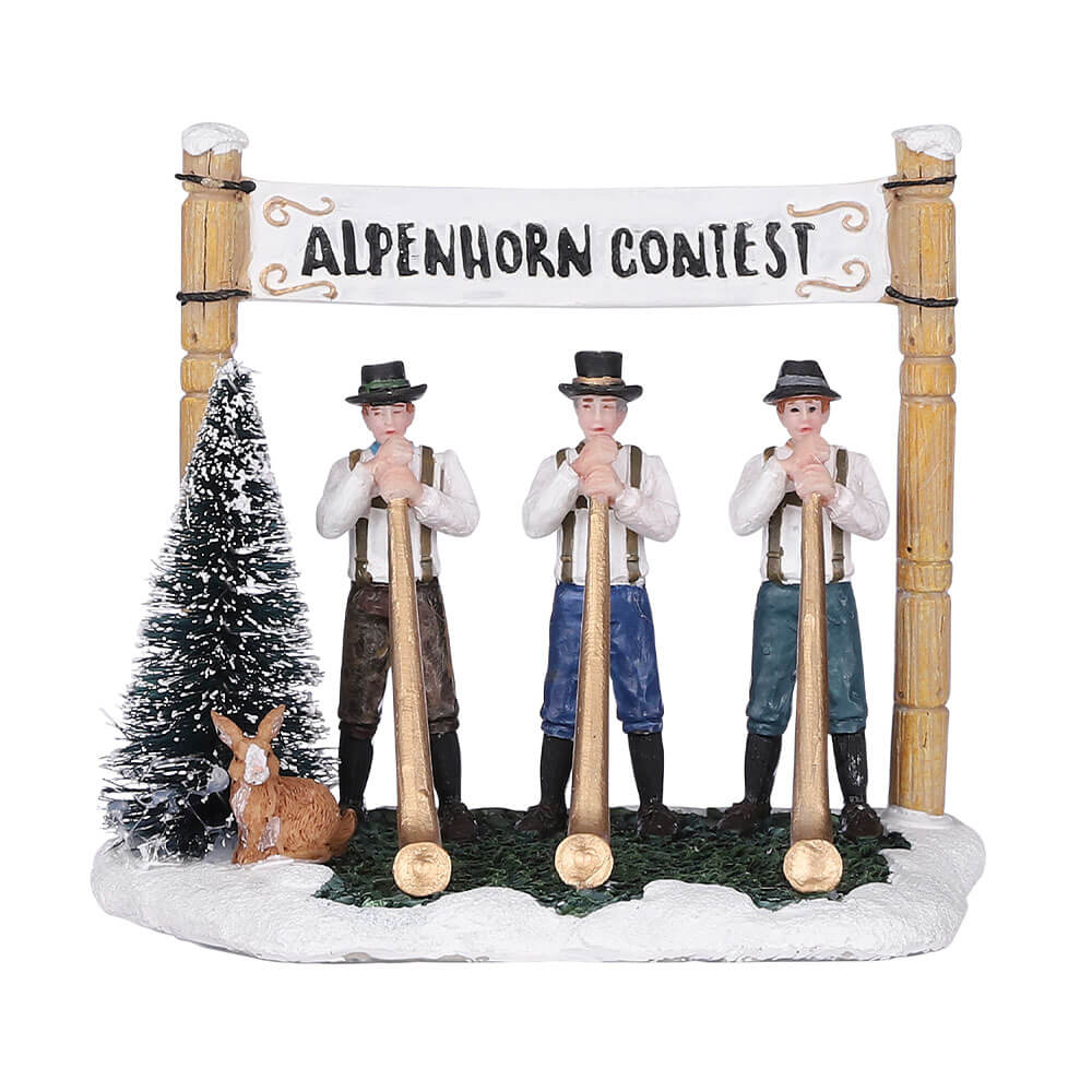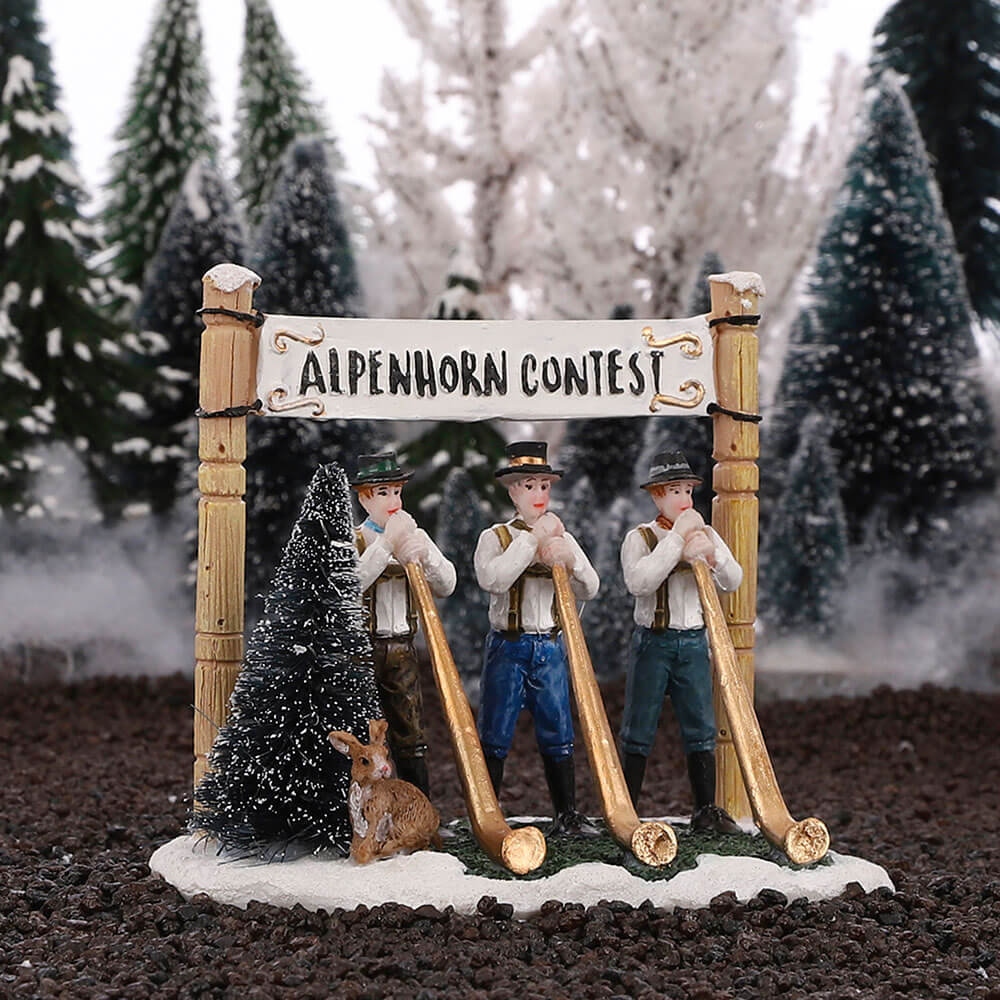 Was wäre ein Ski-Urlaub in den Bergen ohne ein kleines Alphorn-Konzert?! In dieser Miniatur messen sich drei Alphorn-Bläser an ihren goldenen Instrumenten in einem Wettbewerb und sogar ein Hase hat sich als Zuschauer dieser winterlichen Szene eingefunden. Das Miniatur Alphorn-Trio ist eine ideale Ergänzung für Ihr Weihnachtsdorf oder Lichthausensemble. Natürlich können Sie die drei Musiker auch einzeln aufstellen.
