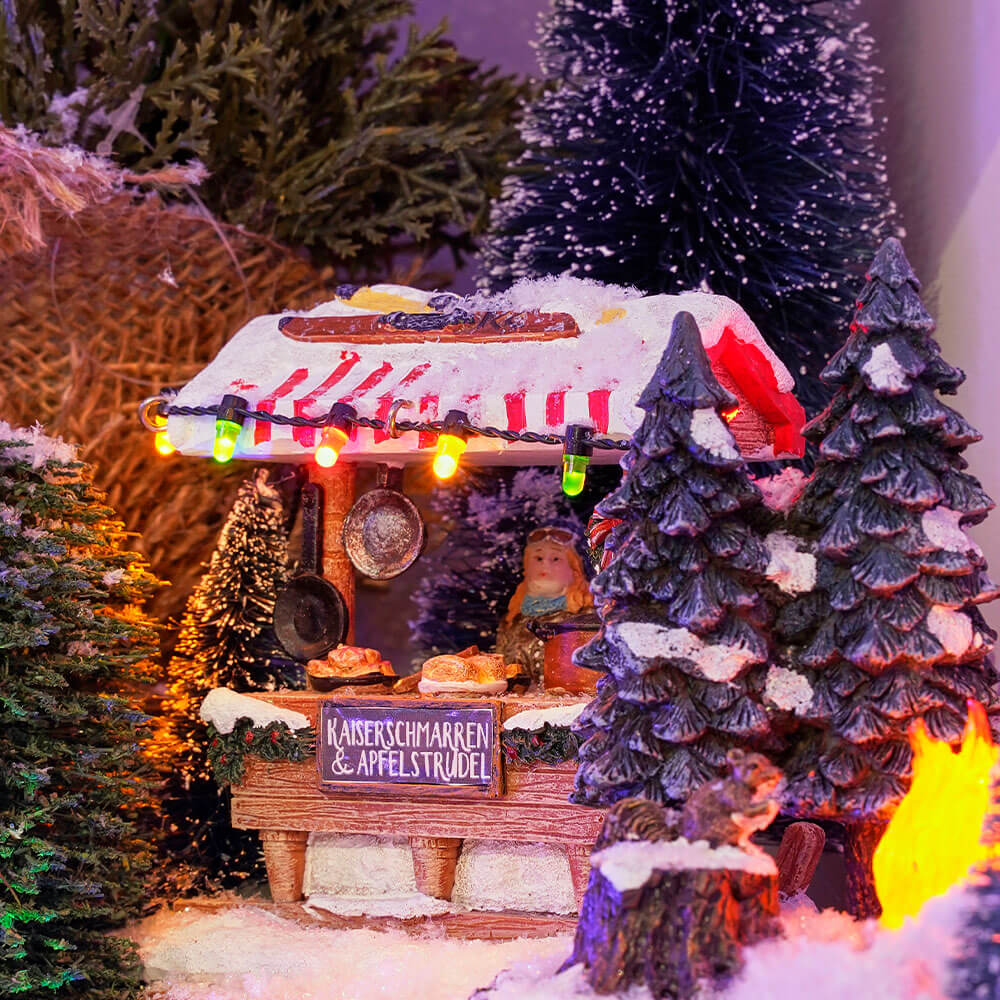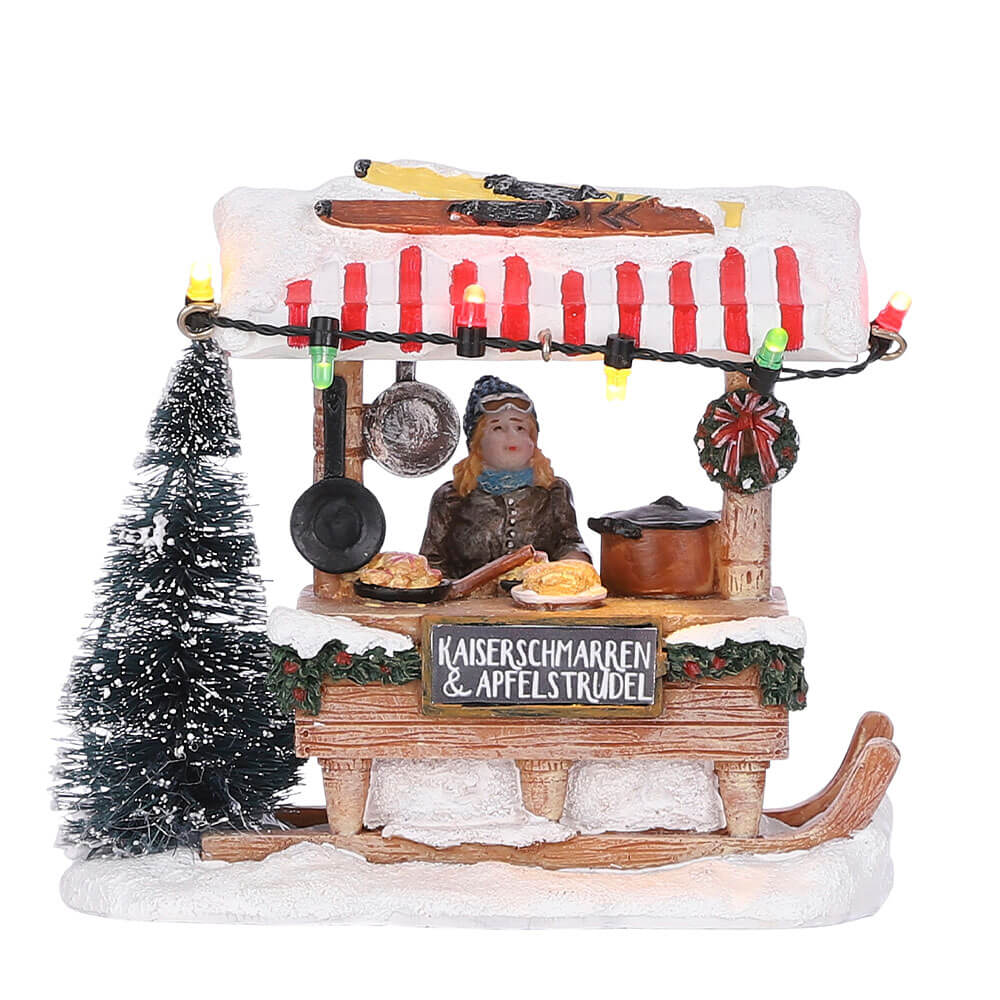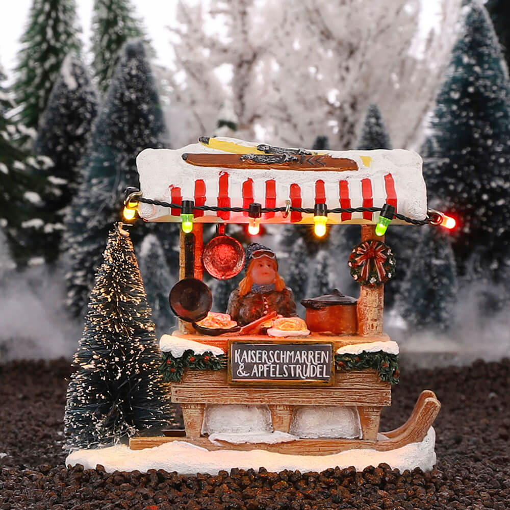 Die handbemalte Miniatur eines Verkaufsstands für Kaiserschmarren und Apfelstrudel aus der LuVille Schneewald Serie macht Appetit auf die süßen Leckereien in den Töpfen und Pfannen! Das warme Licht der bunten Lichterkette sorgt für zusätzliche Behaglichkeit. Der untere Teil des Marktstands ist geformt wie ein Schlitten, wärend das gestreifte Dach mit Schnee bedeckt und Skiern dekoriert ist.