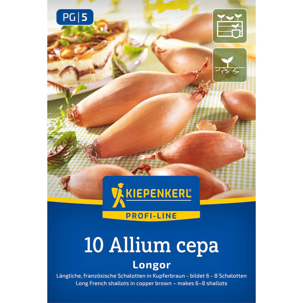 Die Schalotte 'Französische Longor' (botanisch: Allium cepa var. ascalonicum) von Kiepenkerl ist eine sehr aromatische und länglich geformte Edelzwiebel. Die Schalotte 'Französiche Longor' hat eine hellgelbe Schale und ist aus der heutigen Küche nicht mehr wegzudenken. Pflanzen können Sie diese Schalotte von März bis April. Achten Sie dabei bitte auf einen sonnigen Standort, damit Sie von Juli bis September eine reiche Ernte einfahren können. Nach der Ernte empfehlen wir die Zwiebeln zusammenzubinden und zum Trocknen an einem luftigen Ort aufzuhängen.