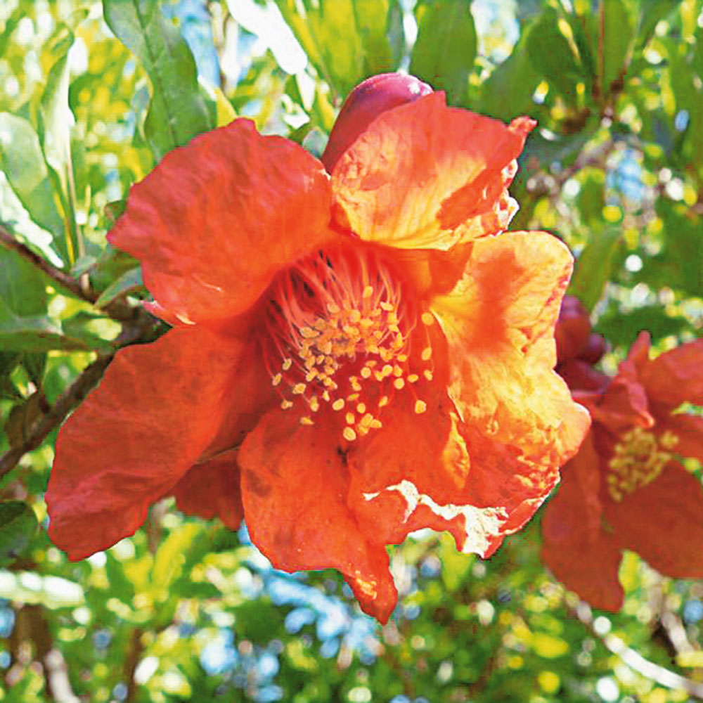 Diese sehr alte Kulturpflanze ist sowohl wegen ihrer saftigen Früchte als auch wegen ihrer Blütenpracht sehr begehrt. Der Granatapfel ist sehr pflegeleicht und dekorativ. Er trägt von Mai bis August rote Blüten, aus denen sich ab August leuchtend rote Früchte entwickeln. Die Pflanze liebt einen sonnigen Standort. Überwinterung bei 5°C bis 10°C an einem hellen Standort. Wuchshöhe ca. 2 m. Starke Container-Pflanzen, ca. 30-40 cm hoch.