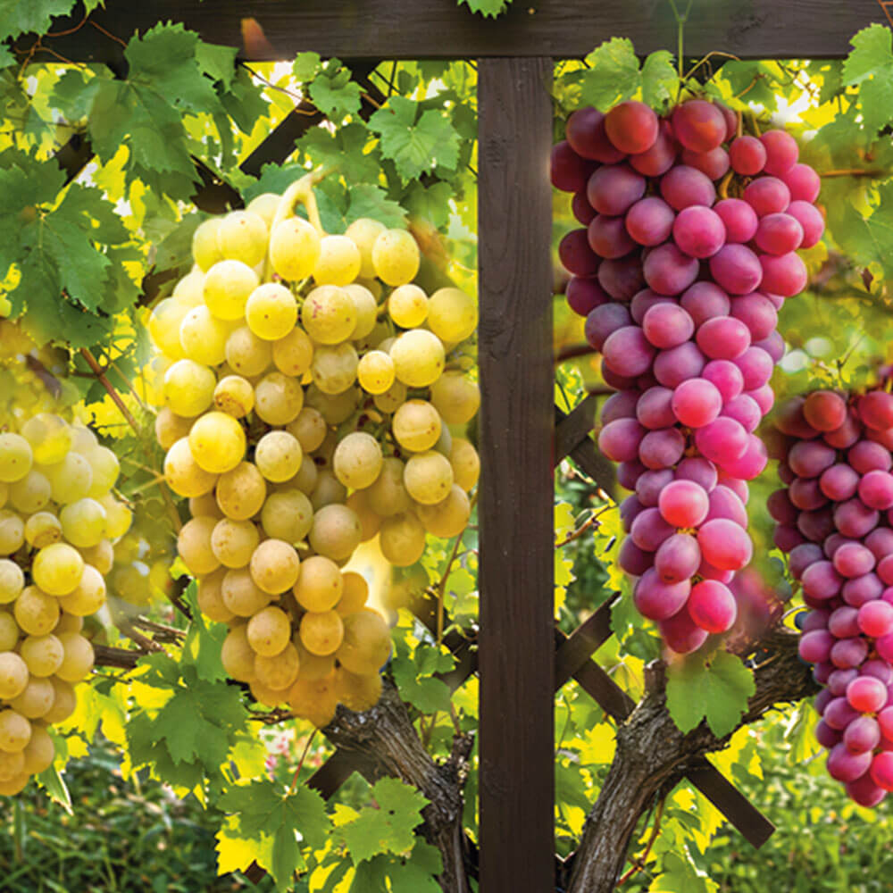 Die Edeltraubensorten Regent und Phönix vereint an einem Spalier. Zusammen im Topf gepflanzt und bereits an ein Spalier gebunden, können Sie so die köstlichen roten und weißen Edeltrauben in harmonischer Zweisamkeit wachsen lassen und im Herbst den Anblick der reifen Weintrauben genießen. Auch geschmacklich überzeugen die roten Weintrauben Regent sowie die weißen Trauben der Sorte Phönix. Herrlich süß und knackig können Sie direkt nach der Ernte genascht werden.