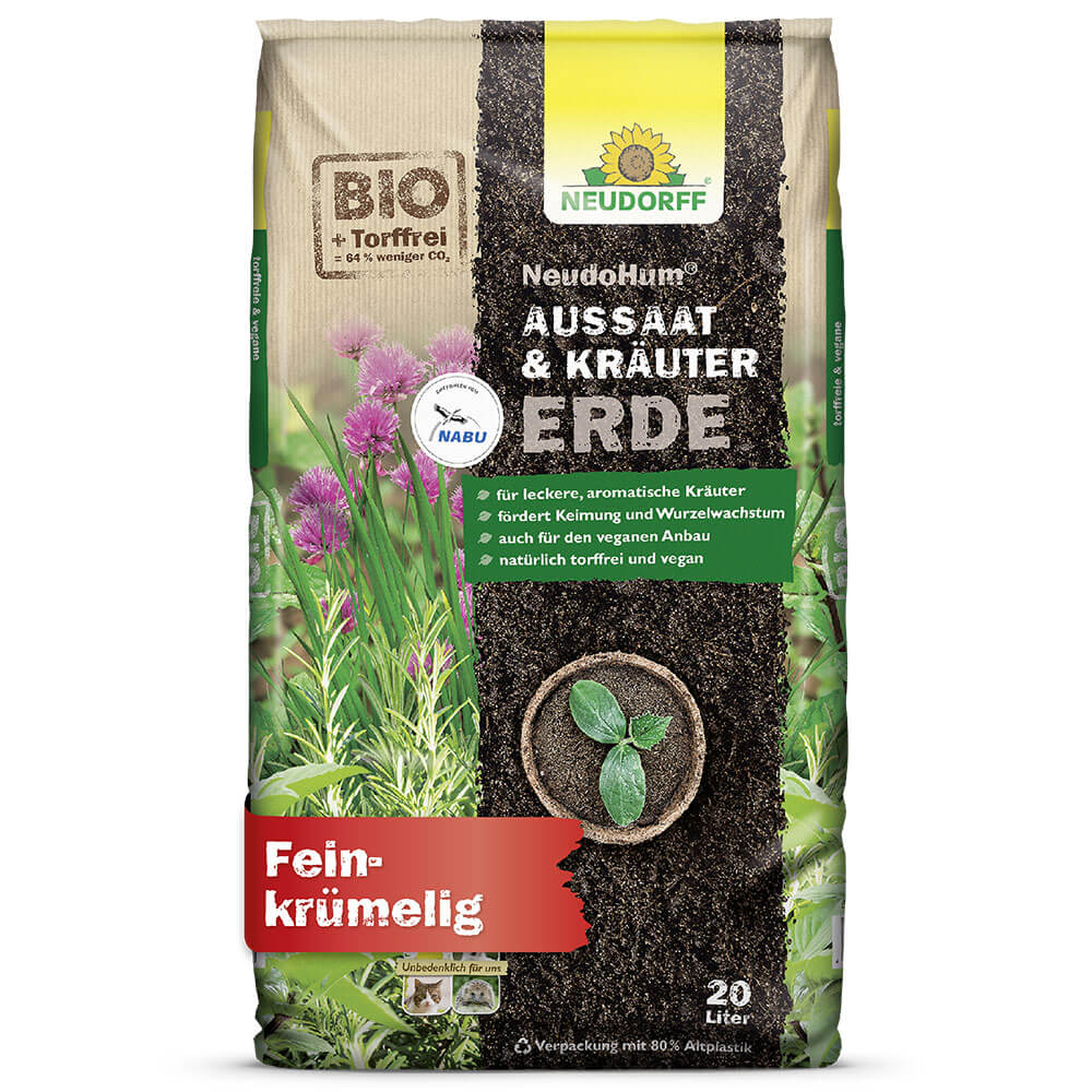 zum Aussäen und Ein- und Umtopfen von Kräutern. NeudoHum Aussaat- & KräuterErde sorgt für eine sichere Keimung und kräftiges Wurzelwachstum. Die feine Struktur des Erdensubstrats